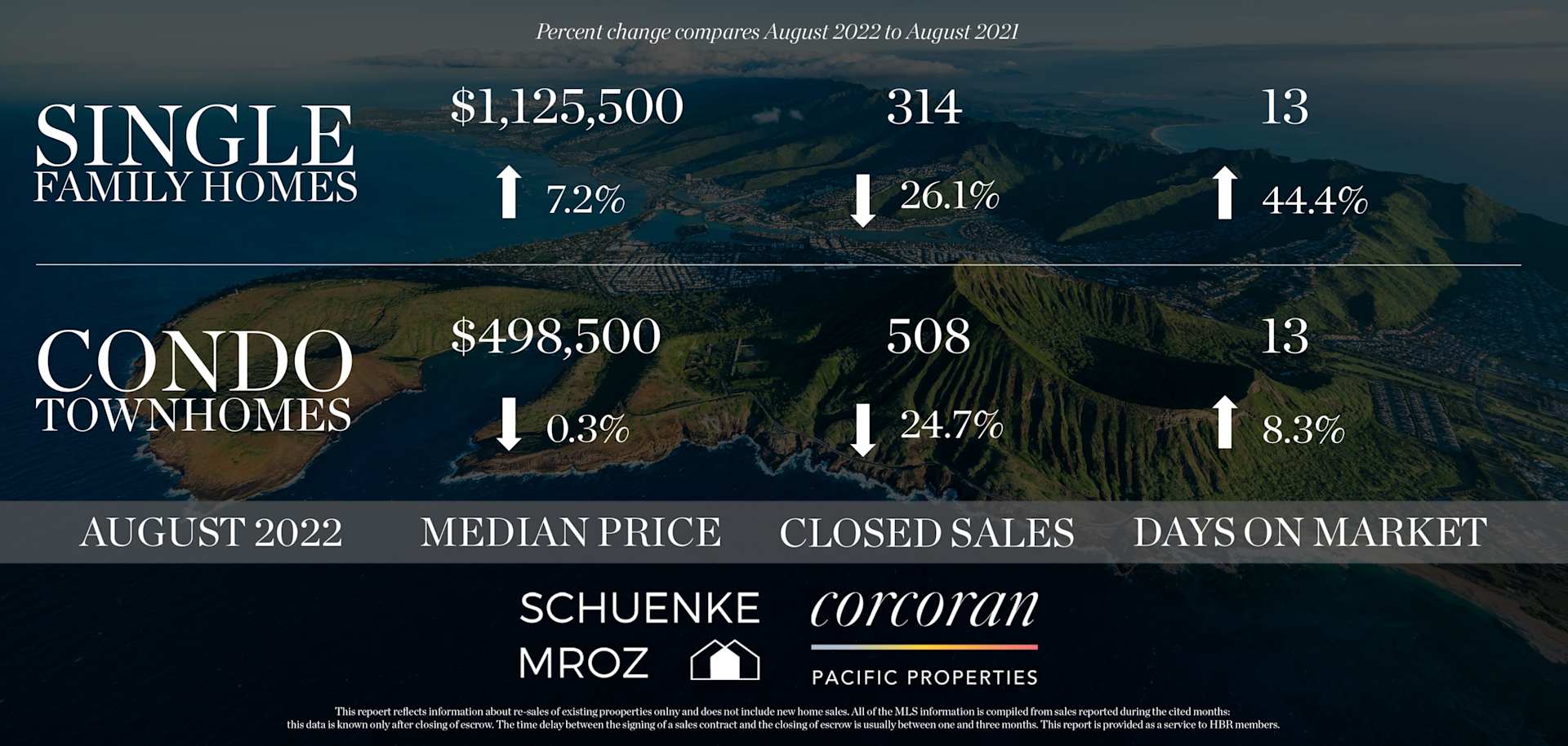 Nearly half – 48.7% – of single-family home sales closed below the original asking price compared to 22.8% a year ago. By the end of August, 13% of the newly listed properties had undergone a price reduction, compared to 4% in August 2021. Of the total active inventory at the end of the month, 38% of single-family homes had experienced a price reduction at some point since being listed, compared to 19% of the active inventory one year ago. The Ewa Plain region accounted for the most price reductions at 23%, followed by the Diamond Head region at 12%, the Metro region at 11%, and the Kailua region at 10%.