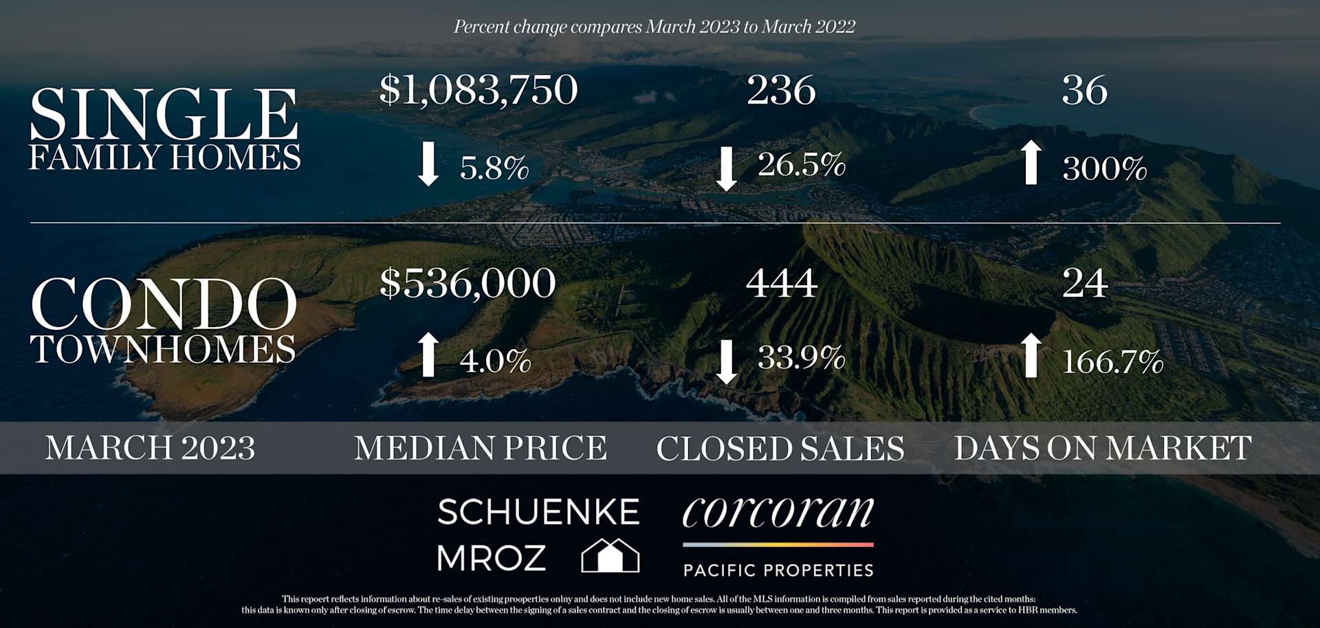 O‘ahu’s housing market experienced a boost in activity from February to March, with sales rising approximately 36% month-over-month in both single-family home and condo markets. Although year-over-year sales continued to fall short of 2022 – down 26.5% for single-family homes and 33.9% for condos year-over-year – 236 single-family homes and 444 condos sold in March 2023.