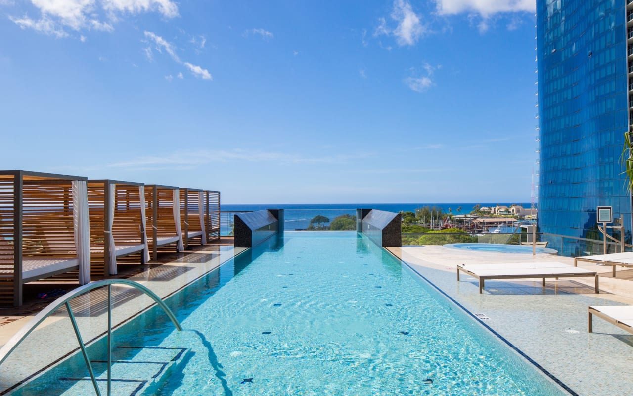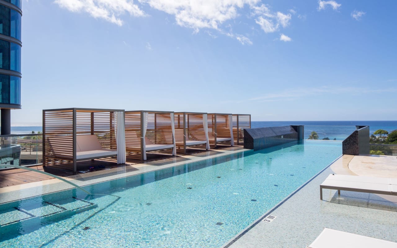 Designed by Chicago-based Solomon Cordwell Buenz in partnership with Benjamin Woo Architects, Anaha is unlike any other luxury condo in the area. The amenity deck on the 7th floor has something for everyone, including the first of its kind in Hawaii, a glass bottom pool extending over the edge of the building!